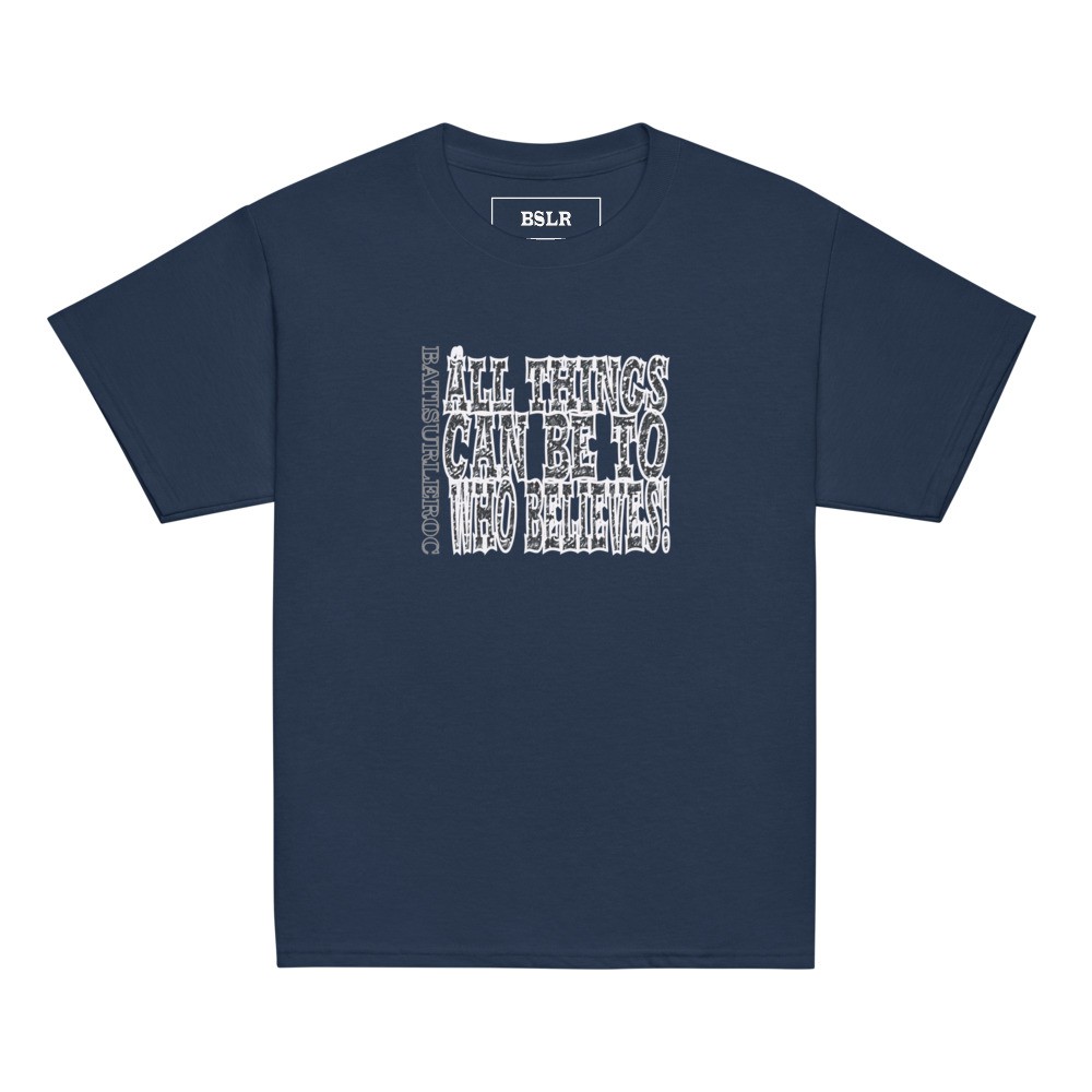 Ce t-shirt signé BATISURLEROC a été conçu pour accompagner les plus jeunes dans leurs aventures, tout en leur transmettant un message de foi, de force et de persévérance :"Tout est possible à celui qui croit." Un t-shirt à la fois confortable, résistant, et chargé de sens, idéal pour les enfants qui rêvent grand et avancent avec détermination.