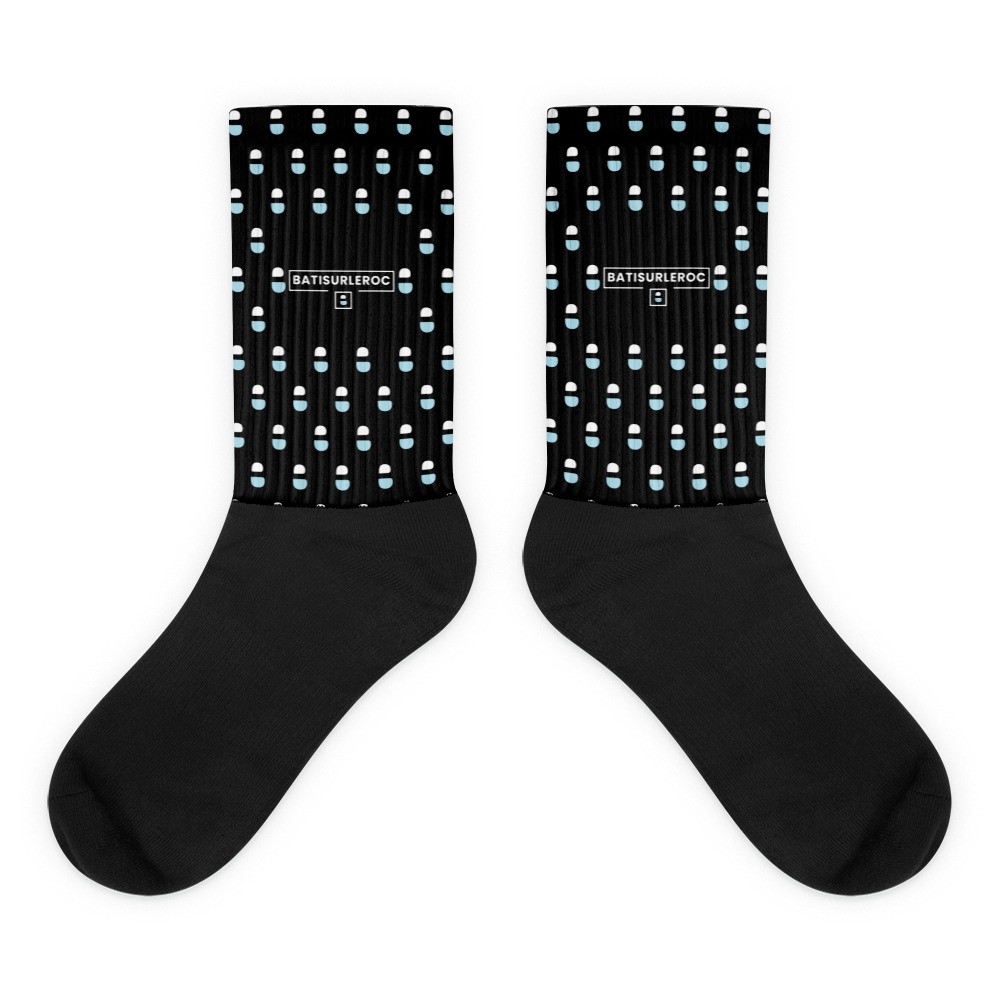 Ces chaussettes sont extrêmement confortables grâce à leur fond rembourré. Elles sont noires au niveau du pied, avec des motifs imprimés aux couleurs vives et éclatantes le long de la jambe.